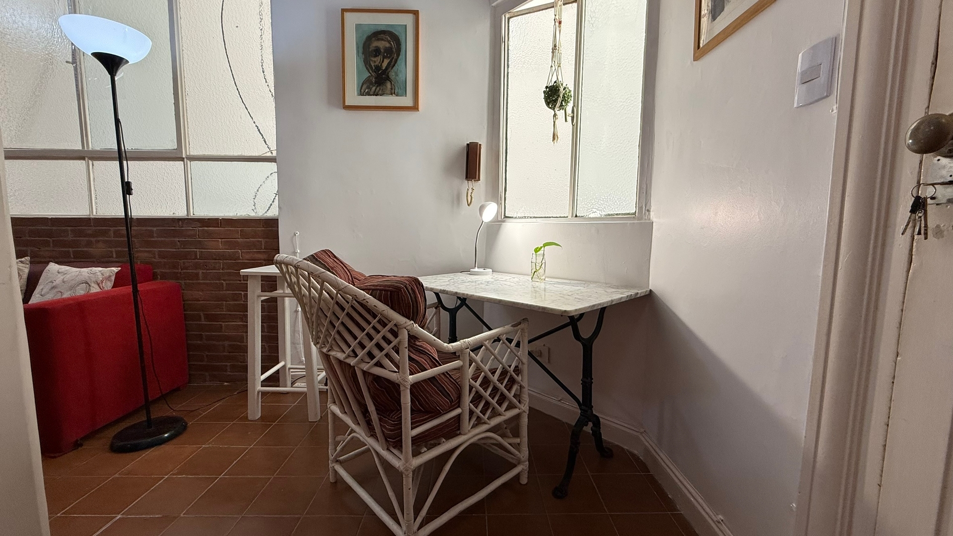 El living cuenta con sillones, mesa baja y un escritorio junto a la ventana, ideal para trabajar o estudiar durante la estadía.